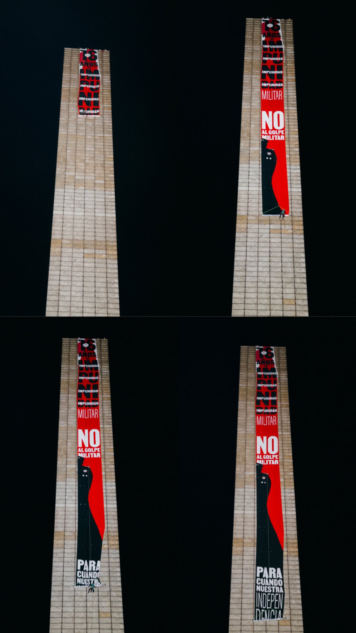 20 horas después de la escalada en la Estela de Luz, el colectivo de familiares de desaparecidos Hasta Encontrarte, desplegó una manta de 100 metros de largo para protestar en contra de la impunidad militar.