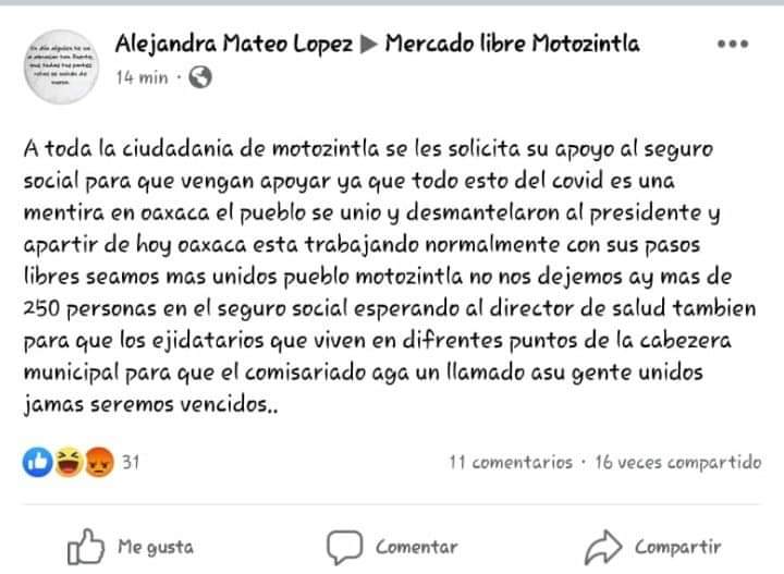 La convocatoria para que los pobladores salieran a la calle fue publicada en redes sociales con el argumento de que el Oaxaca el pueblo se unió y “desmantelaron al presidente“. La publicación en Mercado Libre Motozintla afirma que el virus es una mentira y que gracias a la unión, en Oaxaca “a partir de hoy la gente esta trabajando normalmente”.