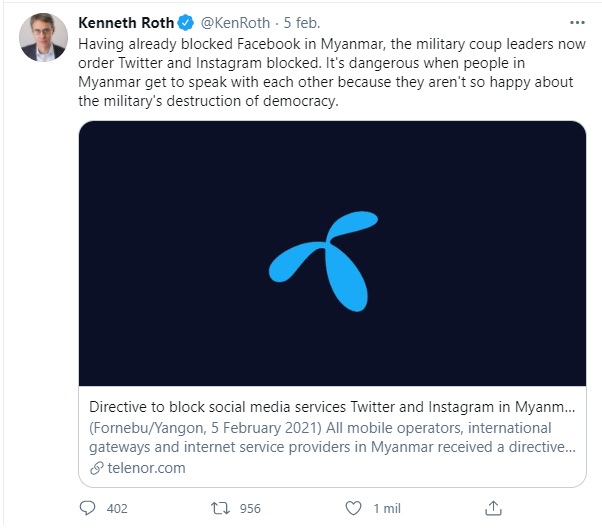 Con estas restricciones a las principales redes sociales, es probable que el mundo jamás se hubiera enterado de sus planes, sin embargo, ‘Telenor’, el operador noruego de telecomunicaciones más grande que opera en Myanmar, no se quedó callado y hizo público la petición proveniente del Ministerio de telecomunicaciones birmano. En un comunicado recuperado por ‘Techcrunch’, la firma dijo que había recibido órdenes para bloquear el acceso a Twitter e Instagram en toda la región.