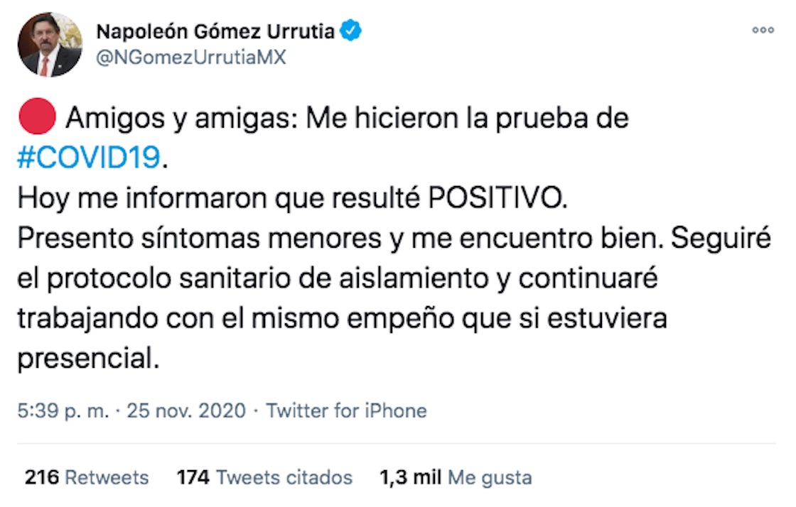 “Amigos y amigas: Me hicieron la prueba de COVID-19. Hoy me informaron que resulté positivo. Presento síntomas menores y me encuentro bien. Seguiré el protocolo sanitario de aislamiento y continuaré trabajando con el mismo empeño que si estuviera presencial”.