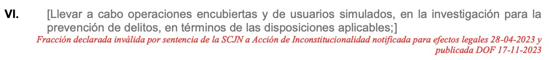 Como les contábamos arriba, fue en 2023 que la Suprema Corte invalidó la fracción VI del artículo 9 de la Ley de la Guardia Nacional, pues a su parecer llevar a cabo operaciones encubiertas y de usuarios simulados en una investigación para la prevención de delitos es desproporcional, ya que “no se encuentra limitada a ciertos delitos, ni se contempla el control judicial previo, lo que permite su utilización arbitraria y puede vulnerar el derecho a la privacidad de las personas”.