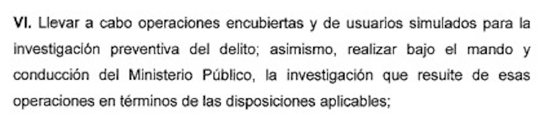 Y en la fracción VI del artículo 9 de la actual Ley de la Guardia Nacional dice que puede “Llevar a cabo operaciones encubiertas y de usuarios simulados, en la investigación para la prevención de delitos, en términos de las disposiciones aplicables”.
