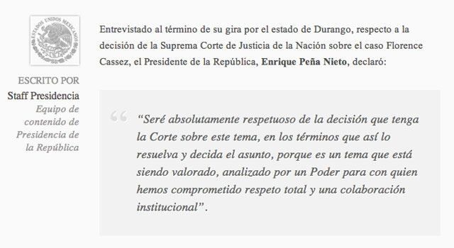 Mientras tanto, la Presidencia de la República ha colgado en su portal de internet la postura de Enrique Peña Nieto al respecto.