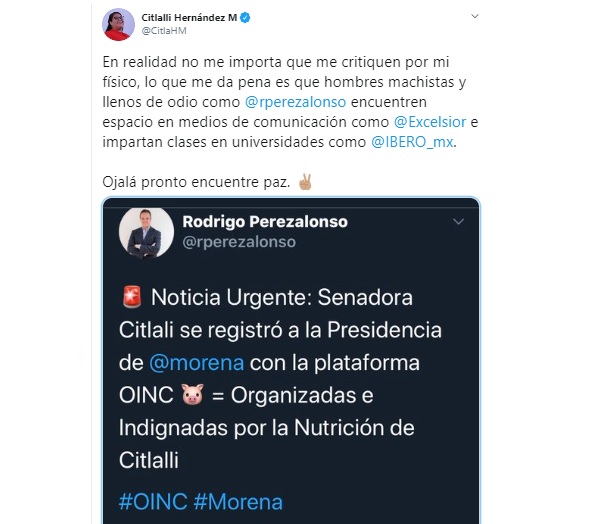 Con lo anterior, el profesor de la Ibero, Rodrigo Perezalonso, decidió echarse un tuit haciendo mella del aspecto físico de la senadora… nomás que no pegó y, en lugar de likes que aprobaran su ocurrencia (que sí recibió uno que otro), lo que recibió fue críticas y, según él, un trato similar al que ofreció a Citlalli Hernández.