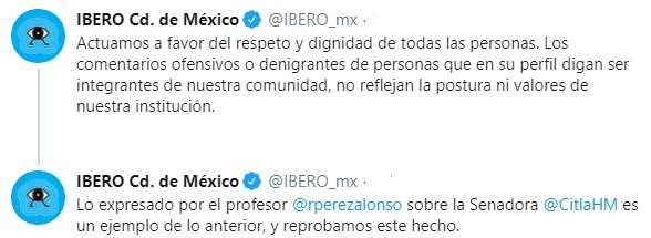 Siguiendo con la tradicional dinámica de asuntos de este tipo, luego de la burla, se pasó a las críticas y luego a las disculpas. Bueno, no sin antes el rechazo de la institución. En este caso, la Ibero reprobó en redes sociales el comentario del profesor Perezalonso, señalando que éste no refleja los valores de la institución. “Actuamos a favor del respeto y dignidad de todas las personas”.