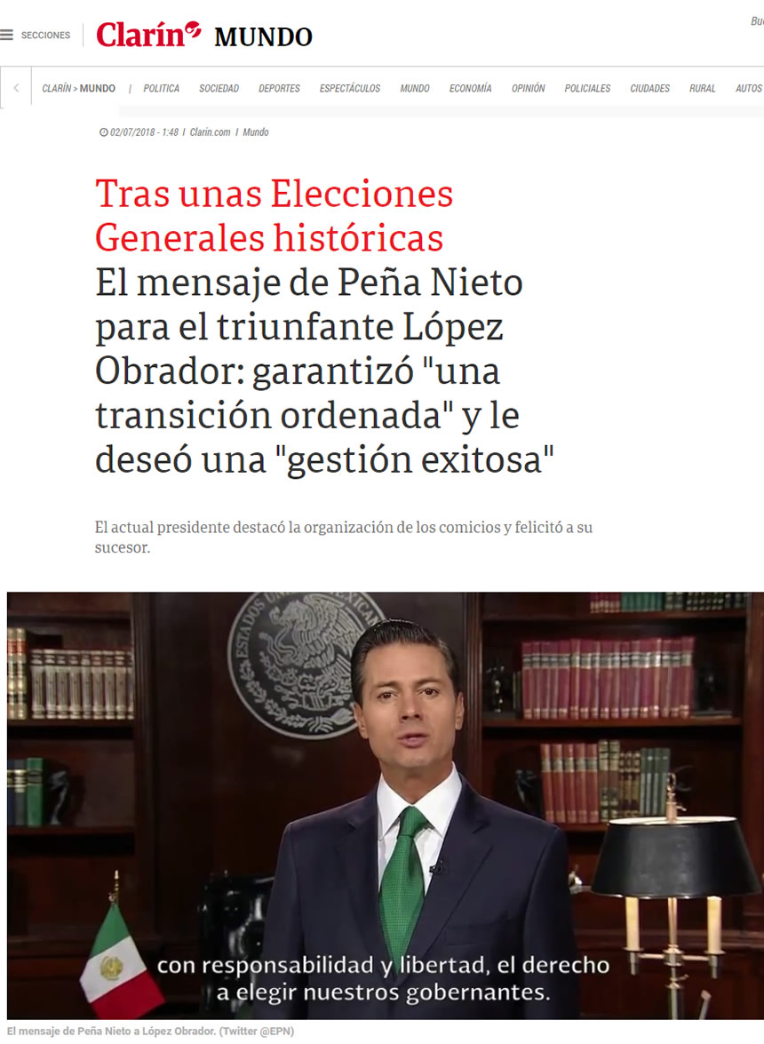 Uno de los diarios más influyentes de América Latina, decide darle la vuelta a la tortilla resaltando el mensaje institucional del partido que sale del poder. El discurso de felicitación del EPN  a López Obrador, garantiza una “transición ordenada y eficiente“.