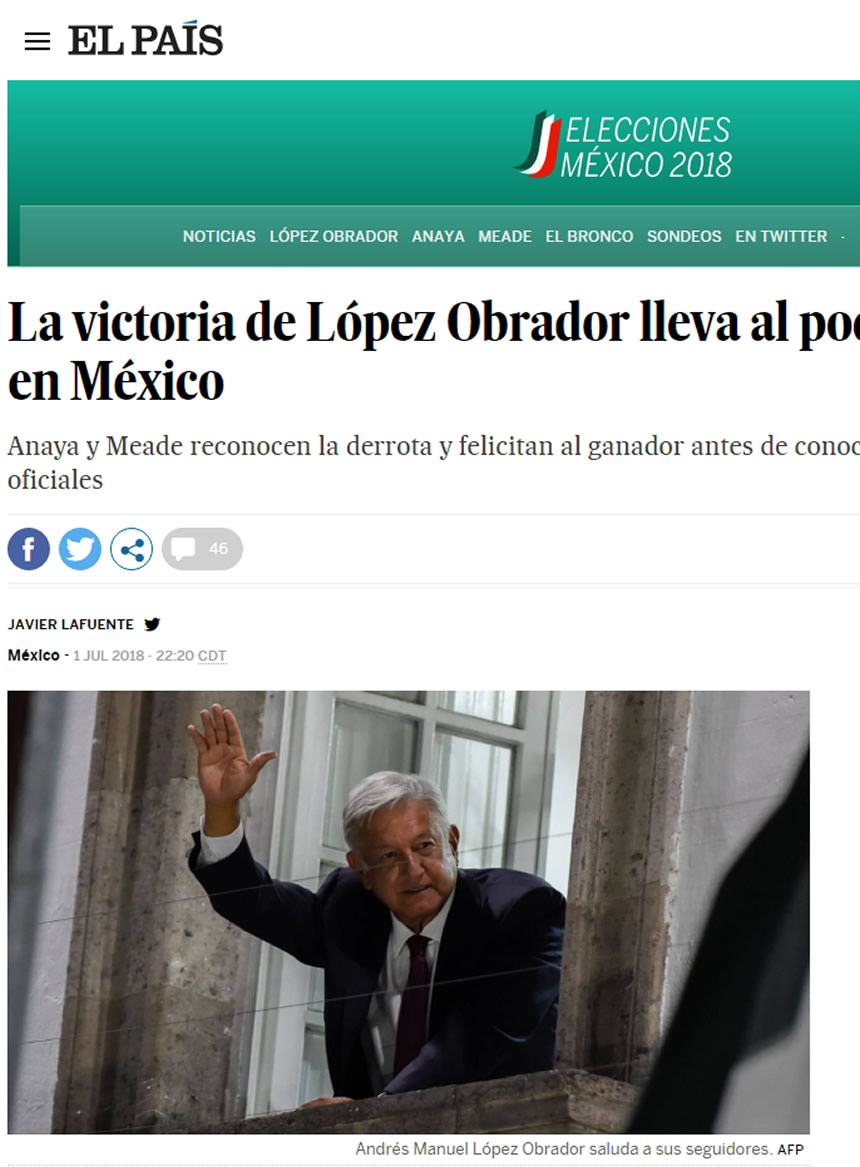 Si hace 18 años el país decidió poner fin a la hegemonía del PRI después de 70 años, ahora exige una transición, un cambio de régimen tras dos décadas de alternancia entre los partidos tradicionales” dice  la entrada “La victoria de López Obrador lleva al poder a la izquierda en México”. Muchas veces, no hace falta que los medios nos digan directamente cuál es su postura, simplemente se lee. Tal es el caso de la prensa española que de forma unánime recibieron de forma positiva el triunfo del “político curtido como líder social”.