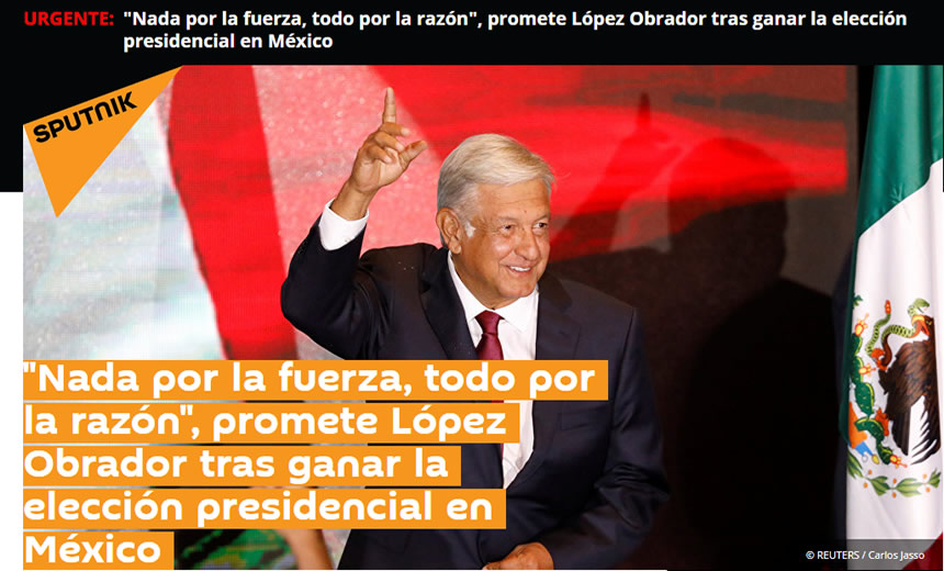 Elecciones en México: el izquierdista Amlo se prepara para la histórica victoria arrolladora  Ese es el título que el diario británico utiliza para dar la noticia del triunfo electoral de Andrés Manuel López Obrador, aunque dentro del contexto, entre líneas se lee una insistencia en la ideología popular del nuevo presidente de México, que tal vez no comulga con la editorial. “Un nacionalista de izquierda amante del béisbol que juró tomar medidas duras contra la corrupción, frenar la guerra contra las drogas en México y gobernar para los pobres ha sido elegido presidente de la segunda economía de América Latina”.