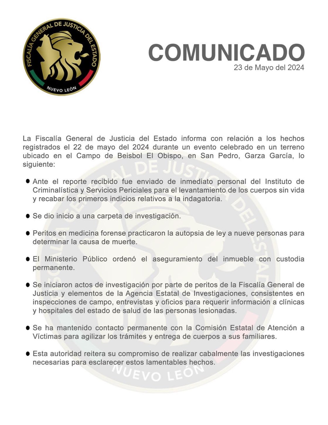 Comunicado de la Fiscalía General de Justicia del Estado de Nuevo León.