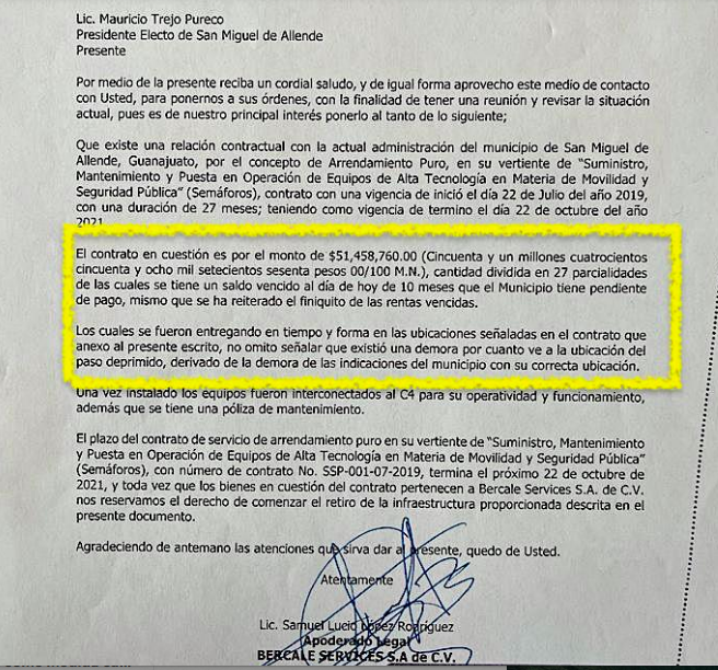 Recientemente el alcalde entrante de San Miguel de Allende, Mauricio Trejo, recibió un oficio de la empresa Bercale Services, en donde le dijeron que eran los propietarios de los semáforos y que el ayuntamiento tenía un retraso de 10 meses en el pago de la renta por los equipos y que el 22 de octubre próximo procederían a quitarlos. Así lo revelaron medios locales.