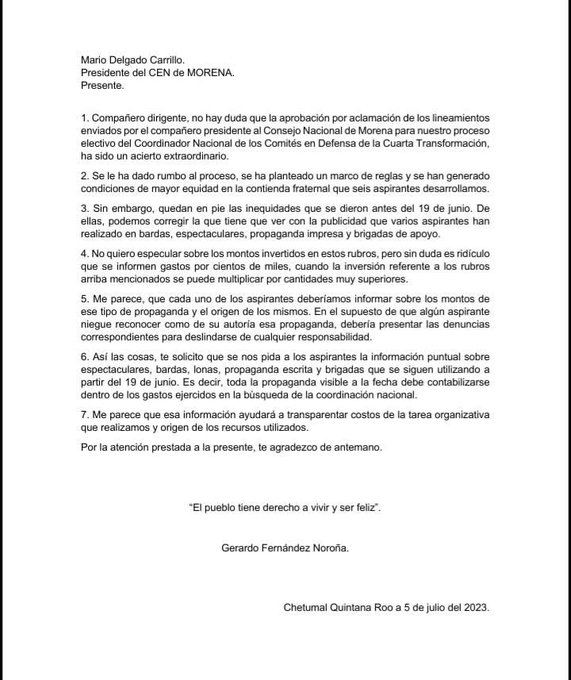 En carta dirigida al líder nacional de Morena, Gerardo Fernández Noroña pide checar y corregir la que inequidades que está detectando en el proceso para elegir al candidato presidencial de la 4T. Especialmente lo que tiene que ver con los reportes de gastos.