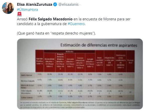 Sin desacreditar el documento filtrado, los consultados señalan que será entre hoy y mañana viernes cuando se dé un posicionamiento oficial… que no podría distar de lo que ahora se adelanta. De acuerdo con la secretaria de Mujeres de Morena, Carol Arriaga, Salgado Macedonio ganaría el sondeo, ya que en Guerrero está normalizada la violencia contra las mujeres.