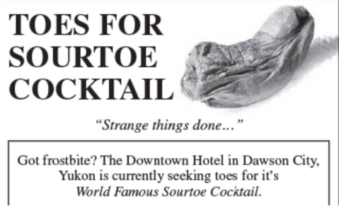 Sabíamos que a algunas personas usan los pies como afiches, pero beberse un trago con dedos del pie, pasa de lo exótico a lo grotesco.  Resulta que un bar en Yucón, Canadá es famoso por preparar el Sourtoe coktail, una extraña bebida alcohólica, que no se puede preparar frecuentemente, a falta de uno de los ingredientes principales: carne humana. Pero en el pasado mes de junio del 2019, el bar del Downtown Hotel, estuvo de fiesta, un hombre donó dos dedos de sus pies para que prepararan esta bebida sin igual.