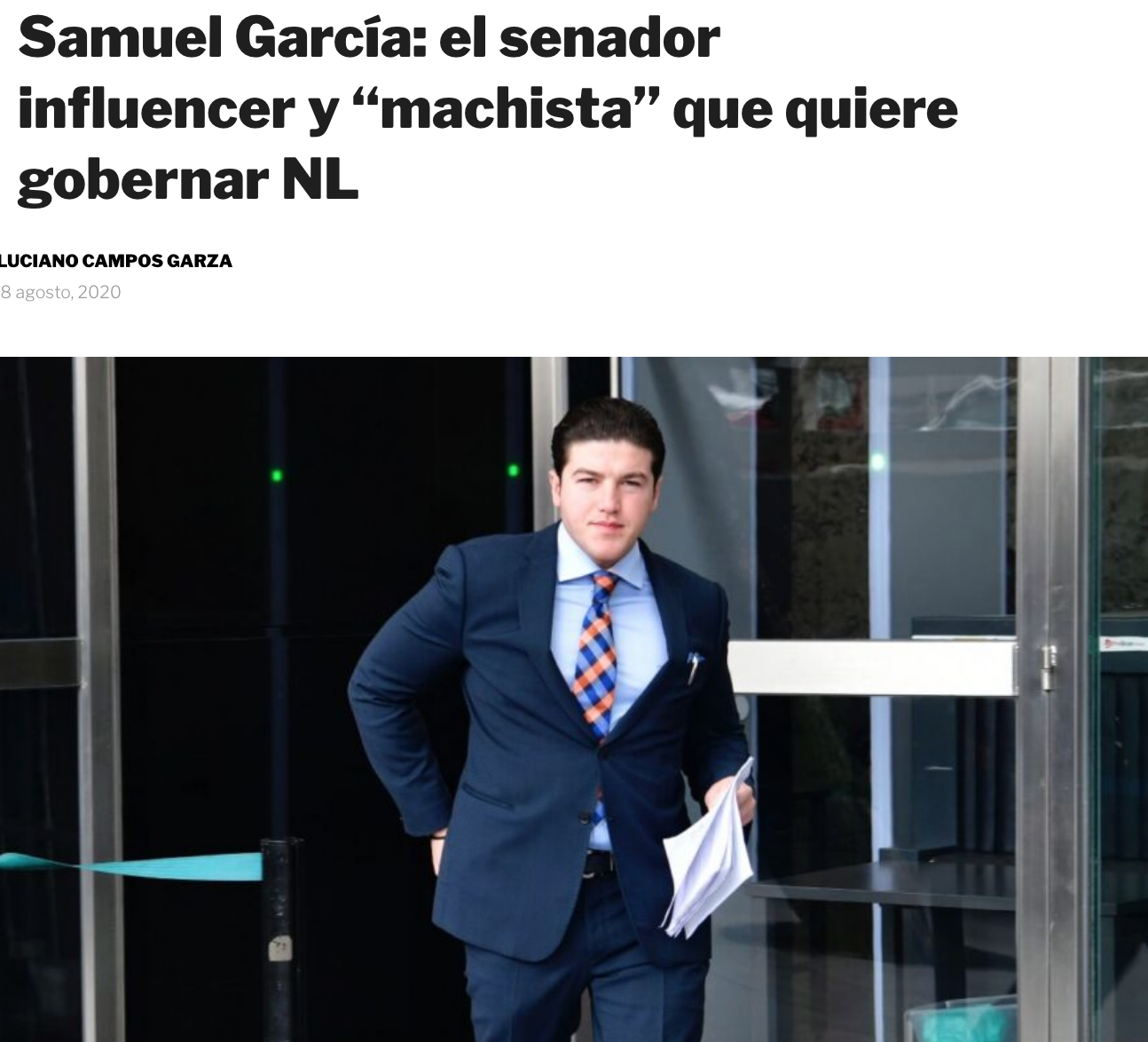 Pues bueno, lo que Samuel no hizo fue poner el título de la nota de Proceso en donde salió su cara, que se titula “Samuel García: el senador influencer y “machista” que quiere gobernar NL”, y en donde dicha revista hace una pequeña recapitulación sobre la carrera política del senador y también, los muchos grandes tropiezos que ha tenido en la misma.