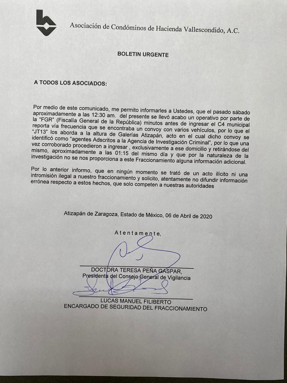 La alcaldesa también compartió un boletín de la Asociación de Condominios de Hacienda Valle Escondido, en Atizapán, mismo que firma la presidenta del Consejo General de Vigilancia, Teresa Peña Gaspar, así como el encargado de Seguridad del Fraccionamiento, Lucas Manuel Filiberto.