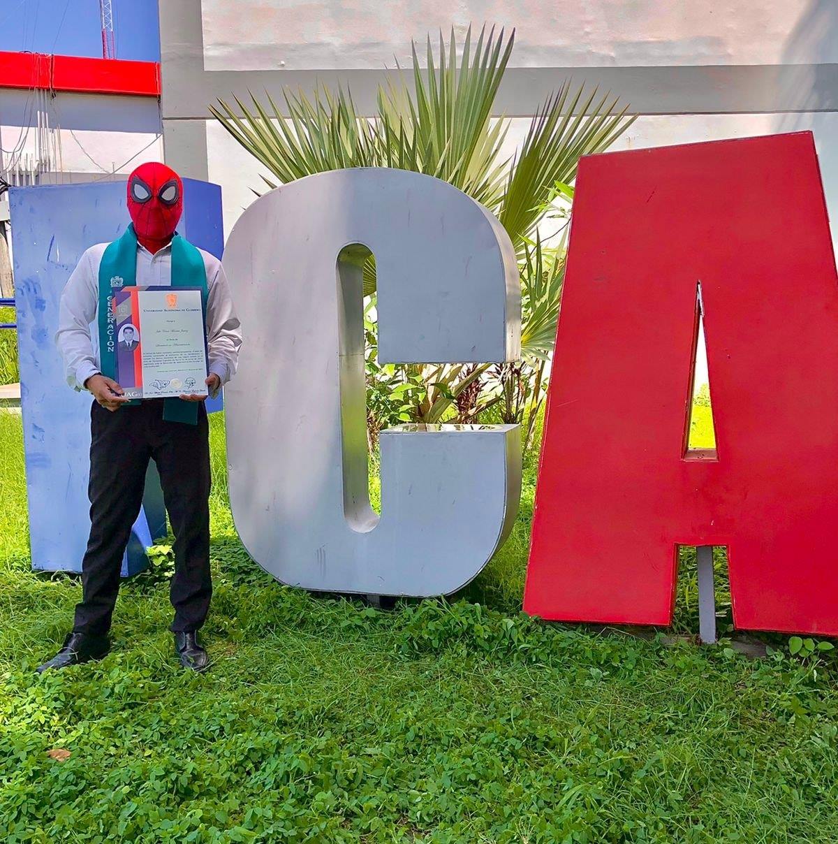 Eso es ser fan y no tibiezas. El lunes pasado, 12 de julio, la directora de la Facultad de Contaduría y Administración de la Universidad Autónoma de Guerrero, Citlalli Arroyo, entregó los títulos universitarios a los graduados, entre ellos a Julio quien decidió recibirlo vestido de Spiderman.