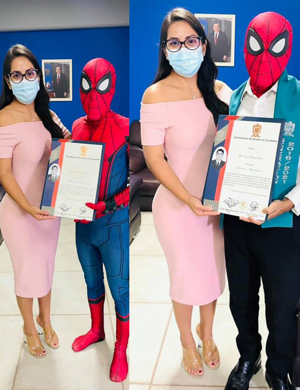 La Universidad publicó en Facebook la foto de la académica junto con el recién graduado y felicitó a Spiderman por egresar de la facultad. Por su parte, la directora de la Facultad explicó que su ex alumno decidió vestirse de su personaje favorito como manera de manifestar alegría.