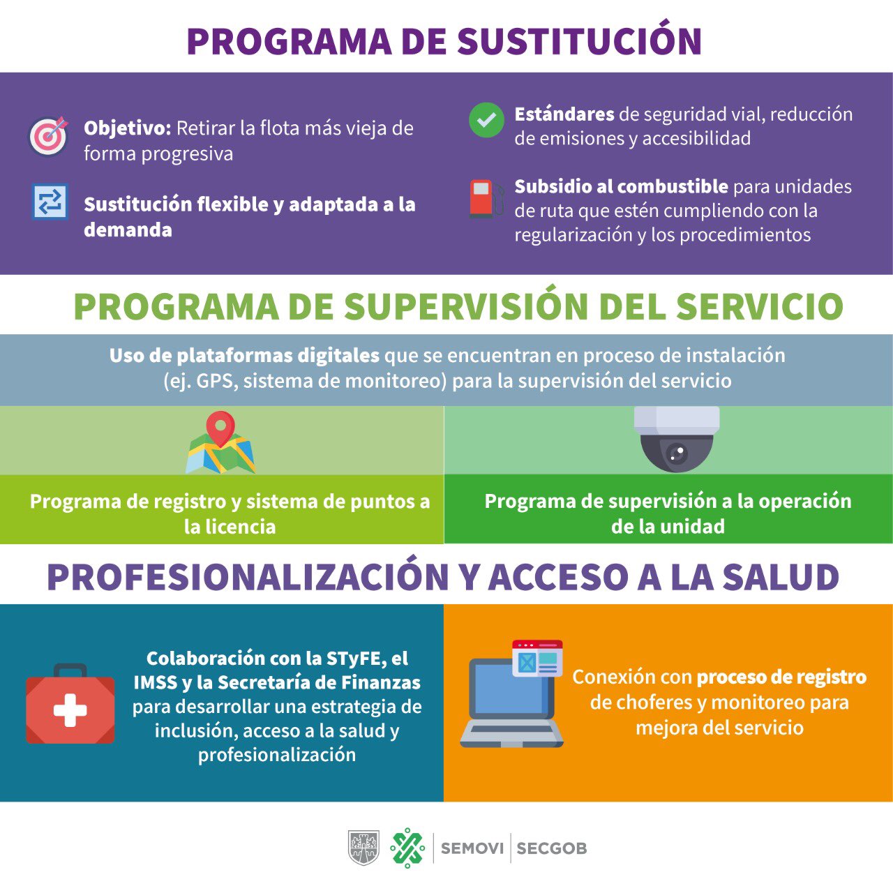 Entre otras cosas este nuevo programa propone la sustitución de unidades con más de 25 años de servicio, supervisión por cámaras, GPS y monitoreo de unidades; así como la profesionalización y acceso a la salud.