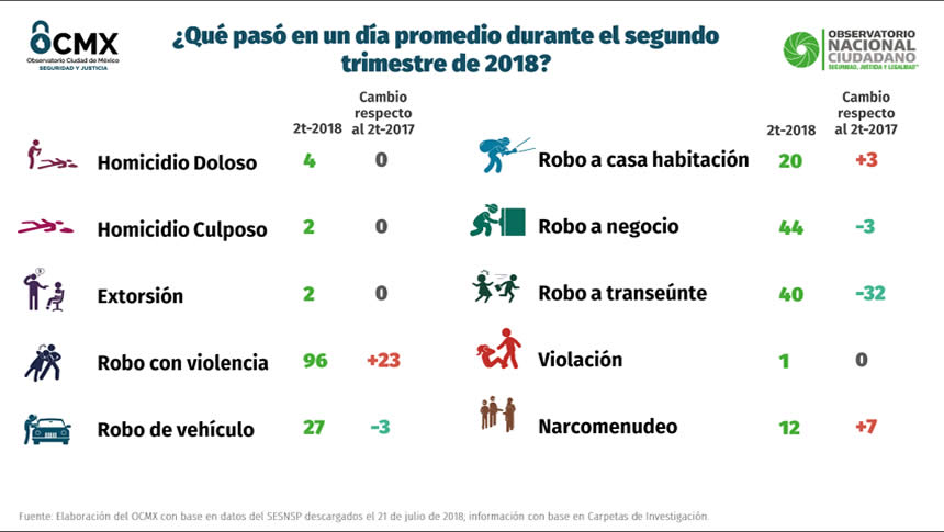 Por su parte, el  Observatorio Nacional dio a conocer su Reporte de Incidencia Delictiva, con respecto al segundo trimestre de 2018, donde indica que los homicidios dolosos y homicidios dolosos con arma de fuego se incrementaron un 13 y 15 por ciento respectivamente. En tanto que el homicidio culposo se redujo un 8.4% a nivel nacional.En los últimos tres meses, hubo menos feminicidios en la Ciudad de México en tanto que en el resto del país aumentaron un 2.6%.