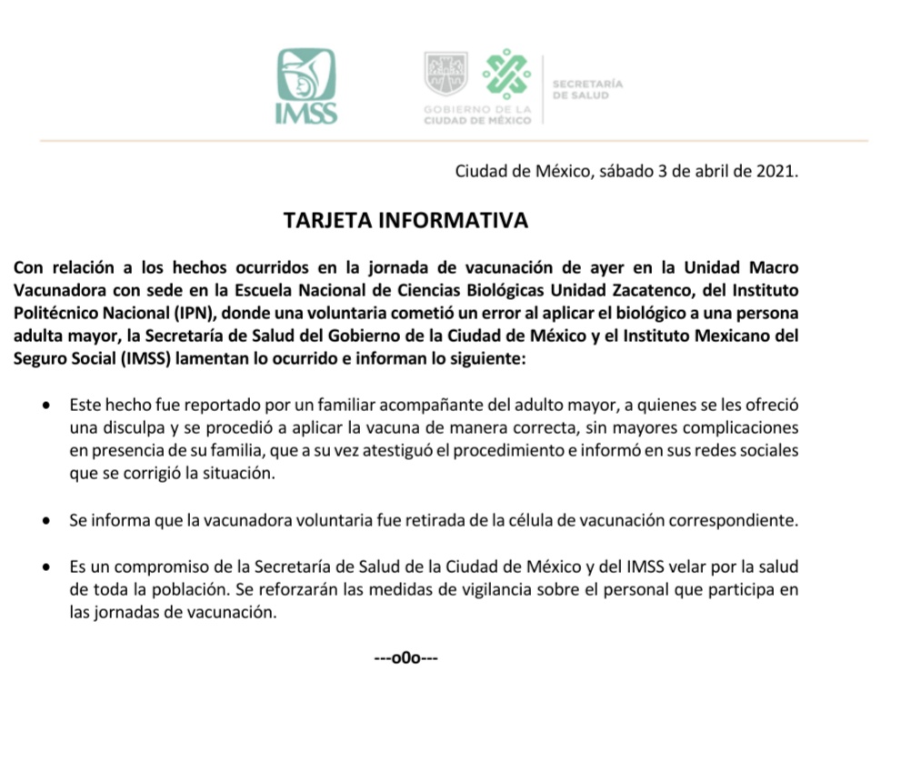 La Sedesa y el IMSS dicen que lamentan los hechos donde “una enfermera cometió un error al aplicar el biológico a un adulto mayor”, pero confirmaron que luego de la queja de su familiar, el señor fue vacunado correctamente. Además, informaron que se reforzarán las medidas de vigilancia sobre el personal que participa en la aplicación de la vacuna.