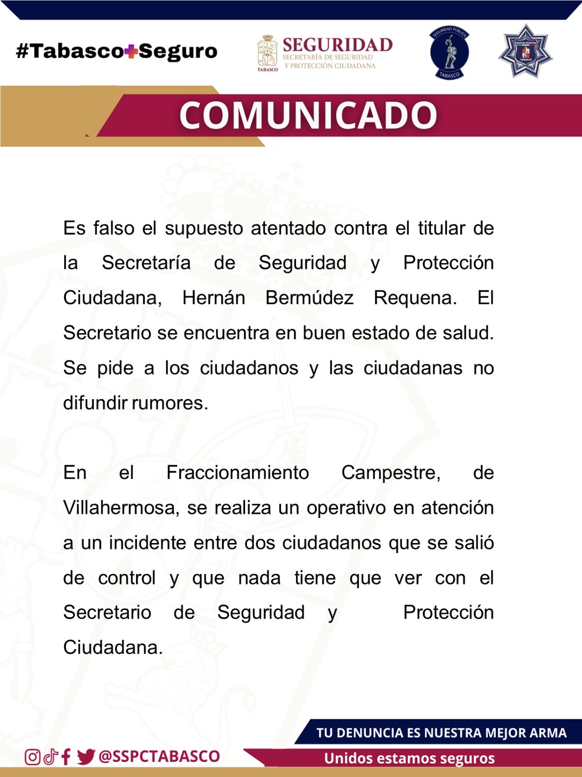 Eso desató el rumor de que se había tratado de un atentado en su contra, pero horas después se desmintió esa versión. La SSPC de Tabasco informó en un comunicado que el funcionario estaba bien, y momentos después, él mismo confirmó que no sufrió ningún ataque.