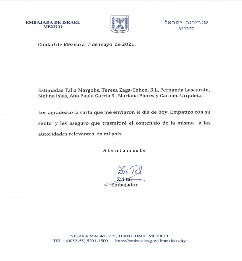 Horas más tarde, la cuenta oficial de Twitter de la Embajada de Israel en México compartió un breve comunicado dirigido a Talia Margolis, Fernanda Lascurain, Teresa Zaga-Cohen, Melina Islas, Ana Paula García, Mariana Flores y Carmen Urquieta, todas ellas víctimas de violencia sexual y quienes firmaron la carta para el embajador Zvi Tal.